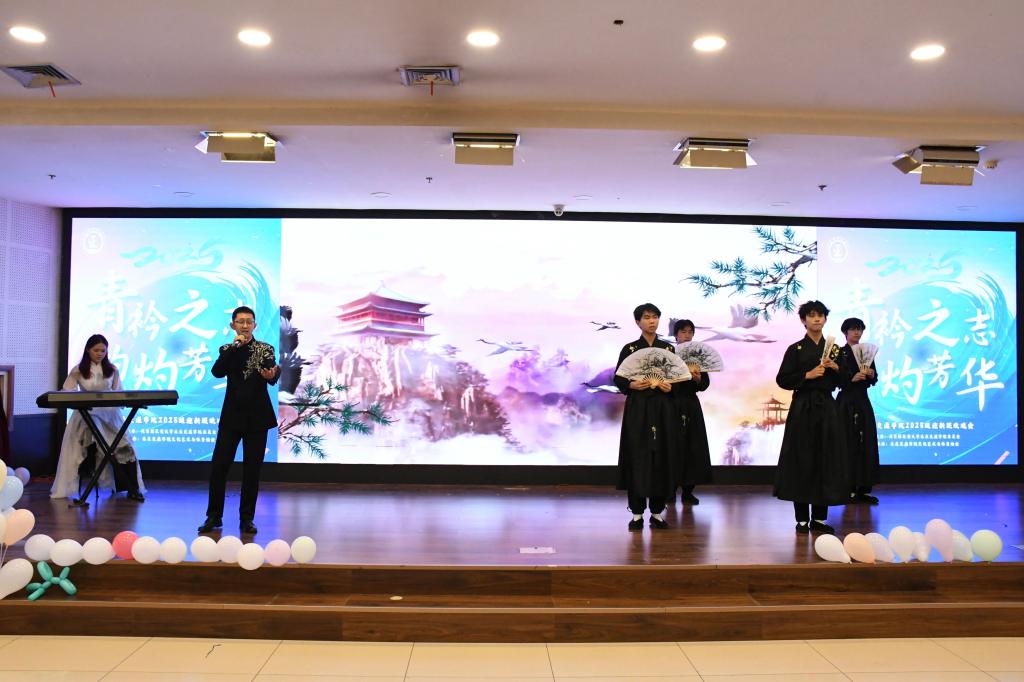 中场环节为晚会注入了温馨氛围,趣味与温情交织。飞花令成语接龙游戏中,八名同学组成两组登台竞技,成语接龙的紧张对决与超时后的趣味惩罚相映成趣,引来阵阵欢笑与热烈掌声。